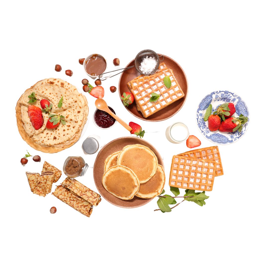 Gofry, pancake’s, muffiny, frużelina owocowa, świeże owoce, 2 rodzaje sosów, nutella/miód.